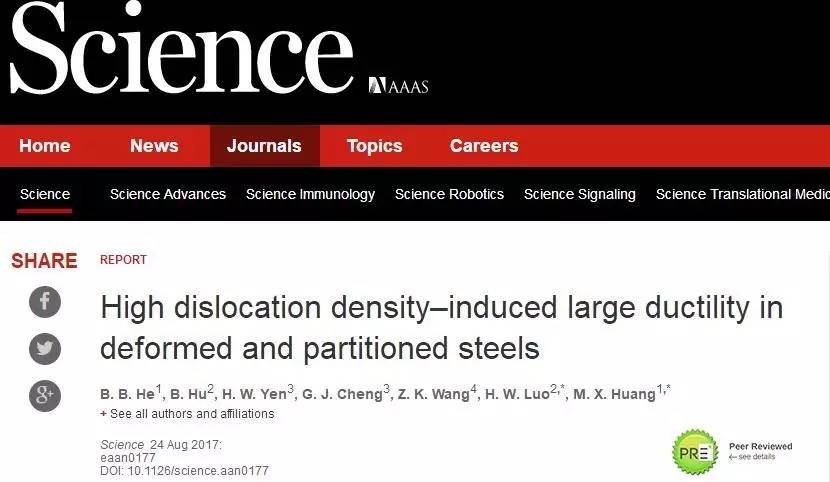 這項由香港大學、北京科技大學、國立臺灣大學、香港城市大學的青年科學家之間的通力合作的研究成果于2017年08月24日在美國著名期刊《Science》發表,文章題目為《D&P鋼中高位錯密度引起高延性》。論文通訊作者為香港大學黃明欣博士和北京科技大學羅海文博士,該論文作者為:B.B. He, B. Hu, H.W.Yen, G.J. Cheng, Z.K. Wang, H.W. Luo, M.X. Huang